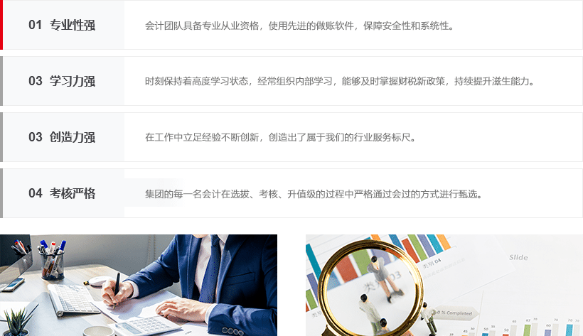 我的企業(yè)提供的財(cái)務(wù)服務(wù),都是基于多年創(chuàng)新經(jīng)驗(yàn)總結(jié)出的科學(xué)流程和做賬標(biāo)準(zhǔn),保證服務(wù)精細(xì),數(shù)據(jù)精準(zhǔn)、專業(yè)高效。